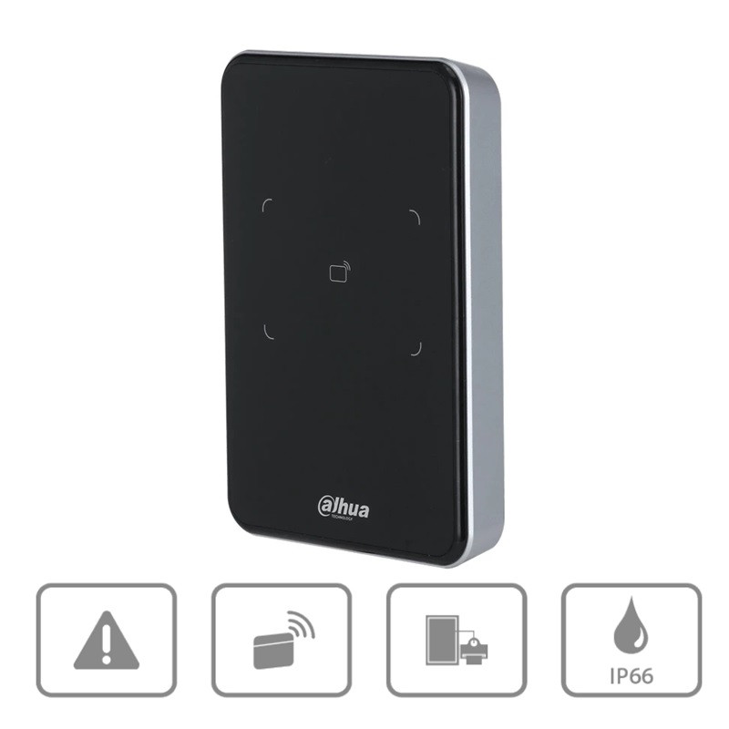 Lector de tarjetas Dahua diseñado para sistemas de control de acceso profesional. Permite autenticación mediante tarjetas ID de 125 kHz y comunicación mediante protocolos Wiegand o RS-485, facilitando su integración con controladores Dahua y sistemas de terceros. Su diseño resistente permite instalación tanto en interiores como exteriores gracias a su protección IP66.